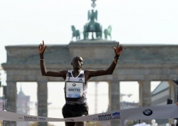 World marathon record for Dennis Kimetto in Berlin.Kenya's Dennis Kimetto has broken the marathon world record in Berlin, winning the race in a time of two hours, two minutes and 57 seconds.The 30-year-old shook off... Read More [+]